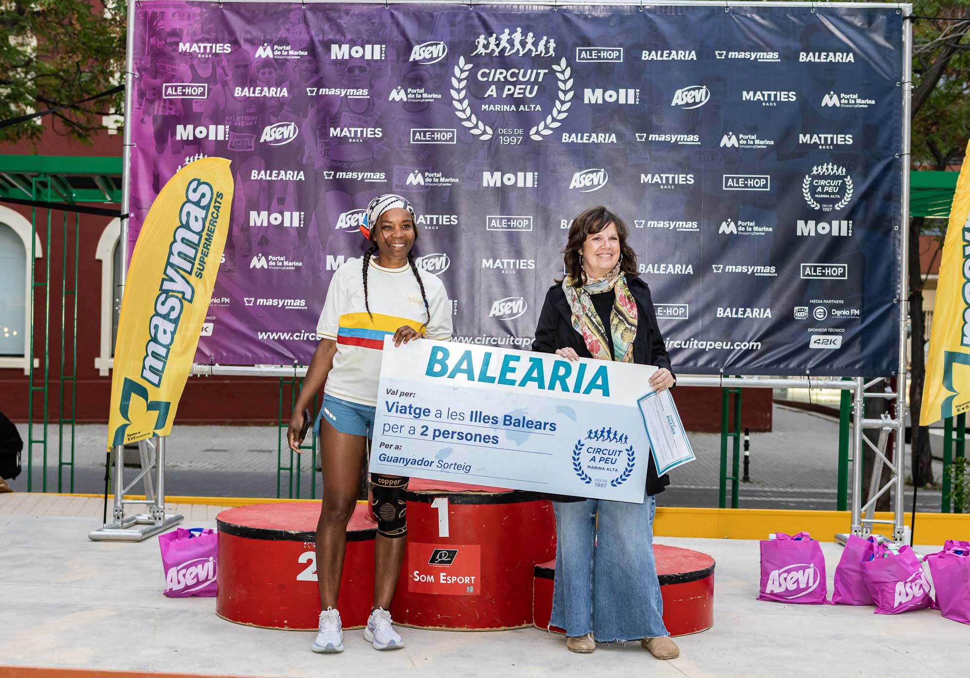 L’agraciada en el sorteig del viatge er a dos persones, que podrà viatjar a qualsevol destí de la naviliera BALEÀRIA, en la Volta a Peu a Dénia, li va correspondre a l’atleta de CA Ondara Tania Belalcazar, que va rebre el premi de mans de la gerent de la Fundació Baleària Maribel Pérez.