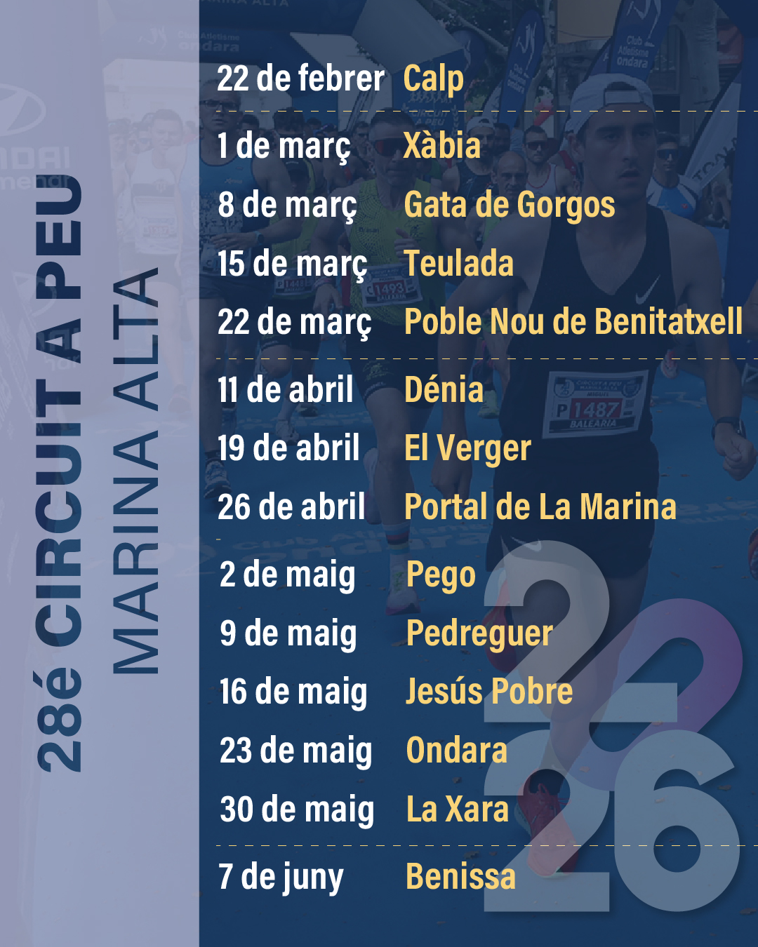 Las 13 carreras que forman el Circuit a Peu Marina Alta se realizan en las siguientes poblaciones, con el apoyo de Clubs deportivos locales y de los Ayuntamientos de: Xàbia, Calp, Gata de Gorgos, Teulada, Poble Nou de Benitatxell, El Verger,C.C. Portal de la Marina, Dénia, Pego, Pedreguer, Jesús Pobre, Ondara, y Benissa.